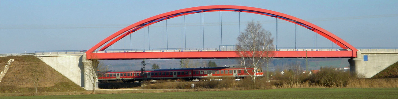 Stahlbrücke über einer 3-gleisigen Bahnstrecke bei Donauwörth.Zeitgleich zum Bau der Widerlager wurde der Stahlüberbau erstellt. In einer Sperrpause wurde der Bau komplett eingehoben. Der Zugverkehr wurde während der Bauphase nicht beeinträchtigt.